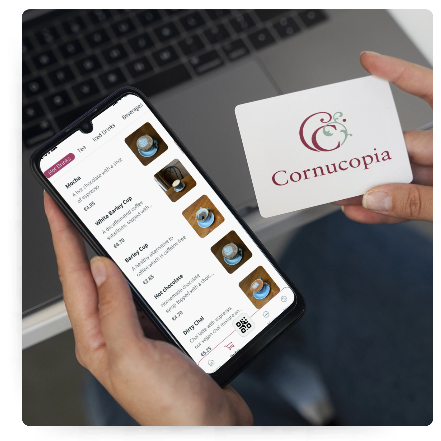 • Customers scan a QR code at their table or log in via the Cornucopia App.