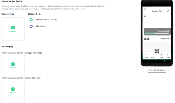 Next click on 'My App' so you can configure how your business will appear within LoyLap. We'll go through each step so you can configure the appearance to be on brand with your business. You can use the preview on the right hand side as a reference.
