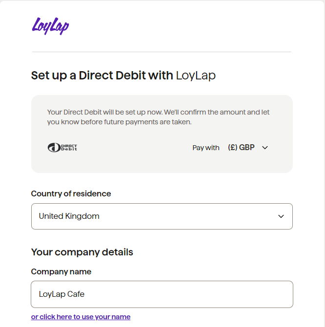 This will open up a new tab prompting you to input the billing details for the business and connect to our billing platform.