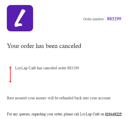 The funds for the order will be processed back to their LoyLap account which can then be used for future orders.