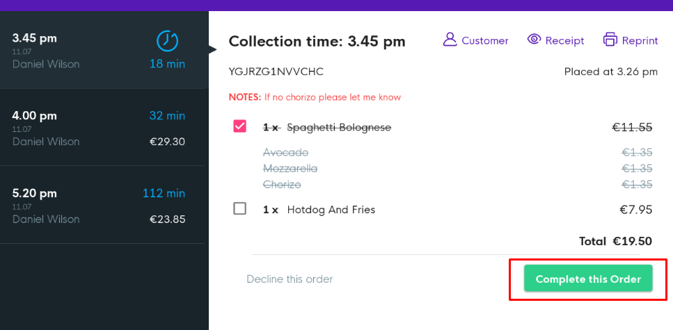 Now once you've prepared your order and the order is ready for collection, you may select the COMPLETE THIS ORDER button. This will notify your customer that your Order is ready for collection. This will move the order stage to COMPLETED.