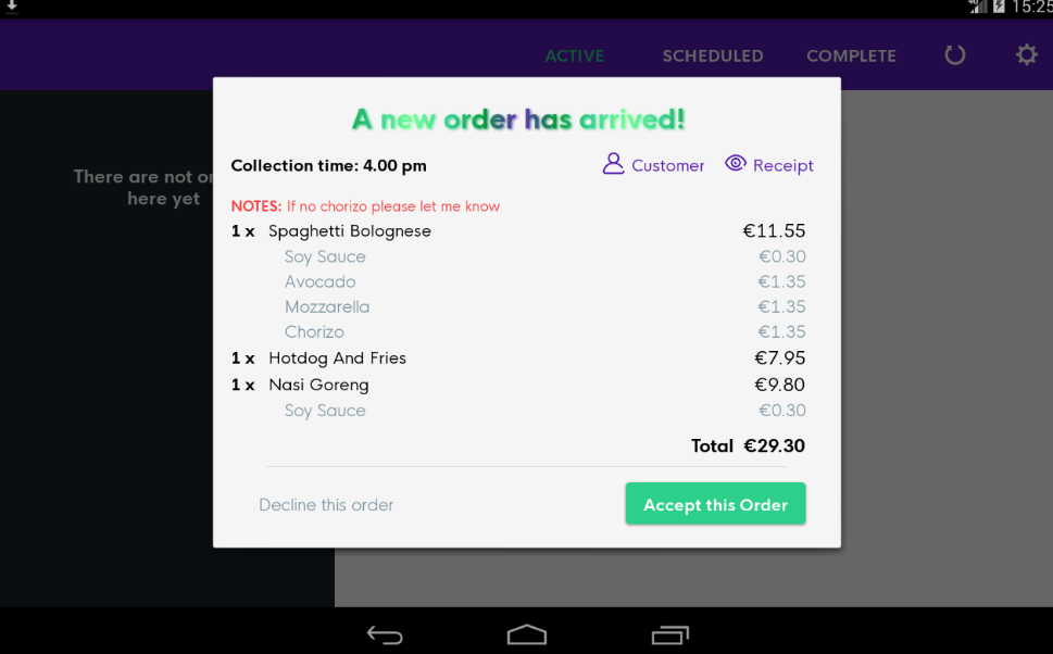 If Automatically Accept All Orders is not turned on, you will get a pop up on your screen with complete order details (as indicated in the screenshot below)