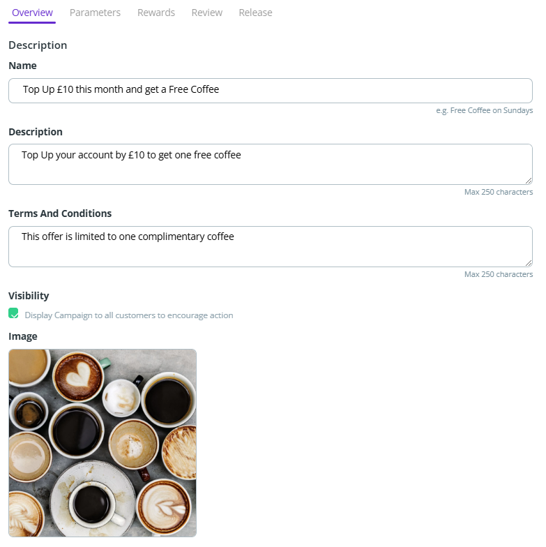 In this example, a month long campaign has been set up to promote account top ups - We have set this campaign to run for one month, seven days a week and to run from opening hours to closing time.