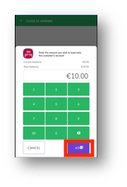 2) After the user is scanned, you will see buttons for 'Load' and 'Redeem' - tap on the 'Load' button.