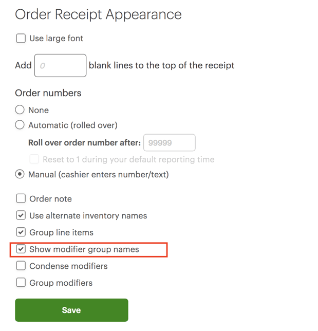 4) Under the receipt options, ensure that 'Show modifier group name for each modifier'