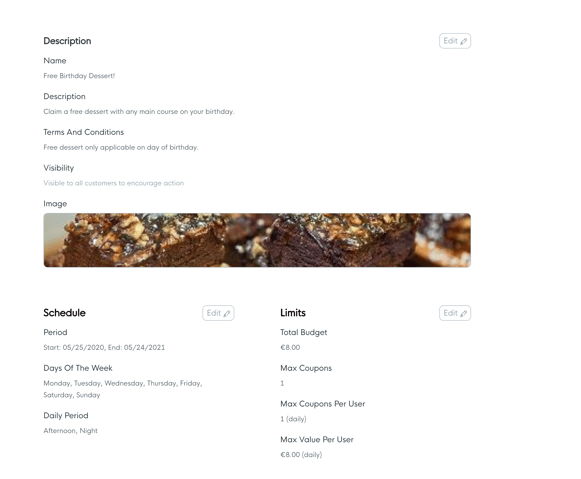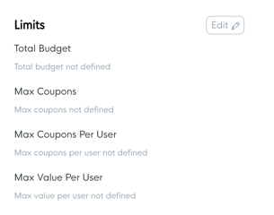 The 'Limits' section will allow you to set a budget for the campaign, a maximum number of coupons, max coupons per customer, as well as max value per coupon.
