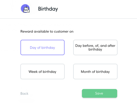 As this is a birthday campaign, you will select 'Birthday'. You can choose to set the promotion as redeemable on the day of, week of or month of a customer's birth date. Then select 'Save', and 'Next'.