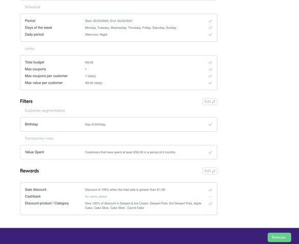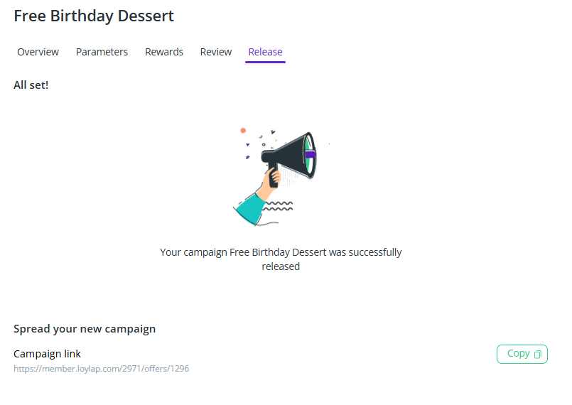 9) Once you've added a reward, select 'Save' and 'Next' in the bottom right corner. Here, you can review your custom campaign. If you have a custom branded app, you can enable a push notification. If you don't have a custom branded app, select 'Next' again, then 'Release'.