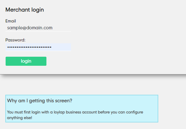 - Log in to the plugin using your Loylap Email and Password (to reset your password please visit loylap.com/forgotPassword)