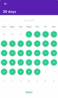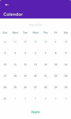 2) After pressing the middle button on the home screen, you will be taken to your transaction history log - To view and export a transaction report for a specific time period, tap the calendar icon in the top right corner of the page and then swipe left on the screen and select the dates you wish to view by tapping on the start date and the end date. Tap ‘Apply’.