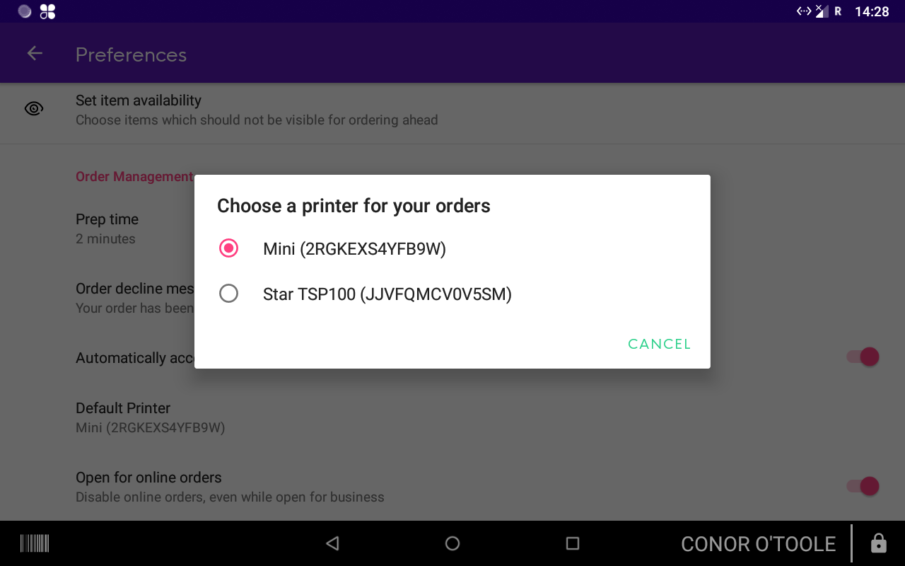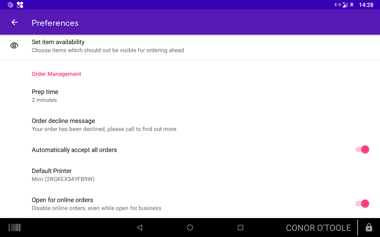 4) Go into the settings in your Order ahead application and then tap 'Preferences' - Ensure that 'Automatically accept all orders' is turned on.