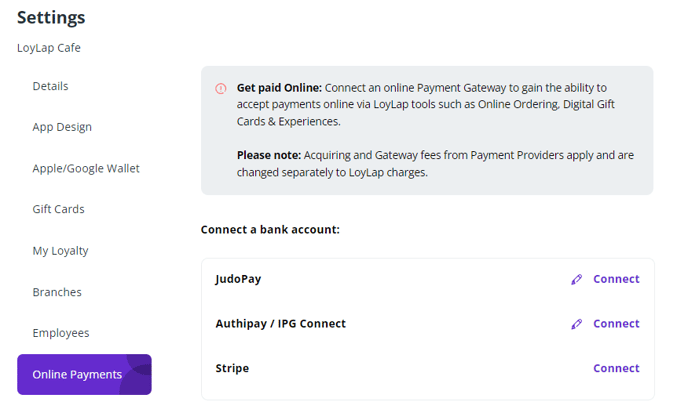 From the LoyLap Dashboard page, click 'Settings', followed by 'Online Payments'