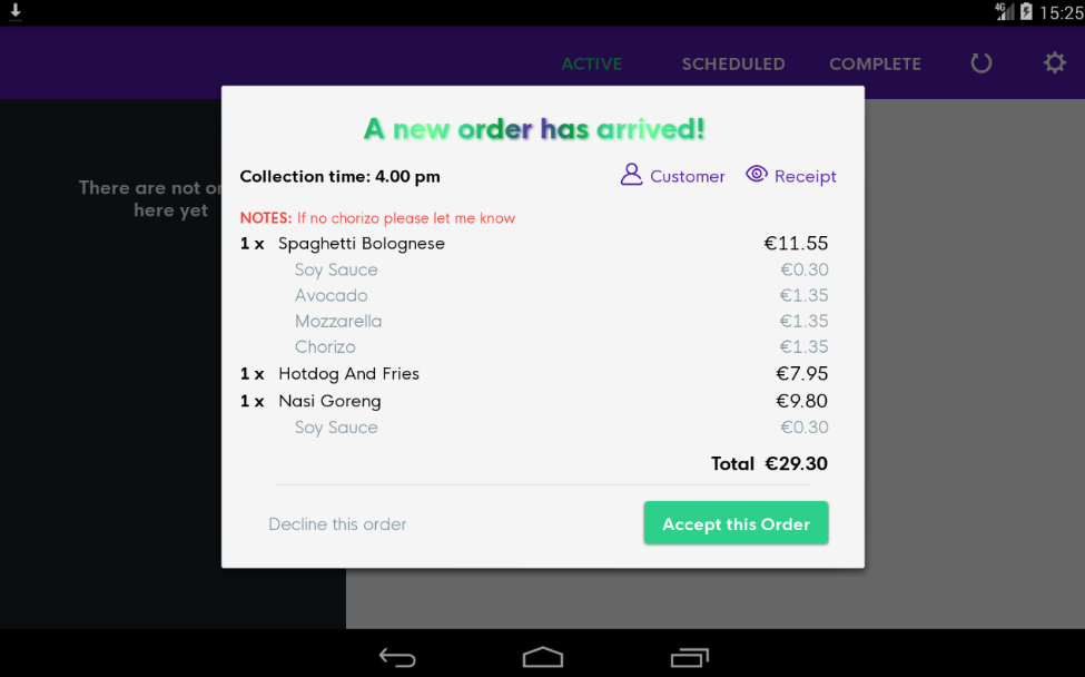 You will receive an alert for every new incoming order on the Clover device which has order configured. You will also be able to hear a bell sound, signalling an incoming order.