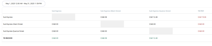The branch names are listed on the left hand column and are also the column headings. These allow you to see in which locations that have had a card sold in one and then redeemed in another. The top line advises the overall value to pay to the franchisee locations, totaled under the 'To Pay' collumn and the amount each location is set to receive is outlined on the bottom line titled 'To Receive'. It is down to you as a business as to how you wish to reconcile these and pay the franchisees in accordance to these loads and redemptions.